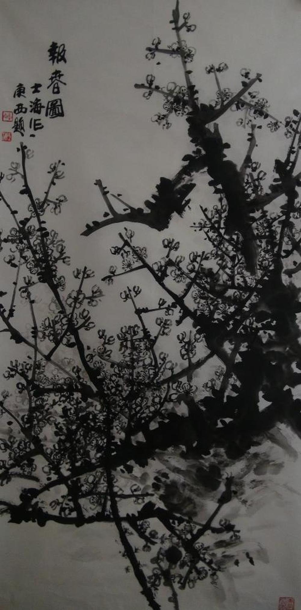 用墨先勾出梅花之势态,后点花而成。